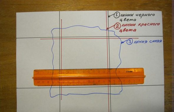 На вырезанный лоскут (неровная линия синего цвета) по красной линии накладывалась металлическая линейка и очень плотно прижималась к лоскуту. Далее раствором клея ПВА”Столяр” (в разведении один к одному водой) промазывались последовательно все стороны квадрата по КРАСНОЙ линии.