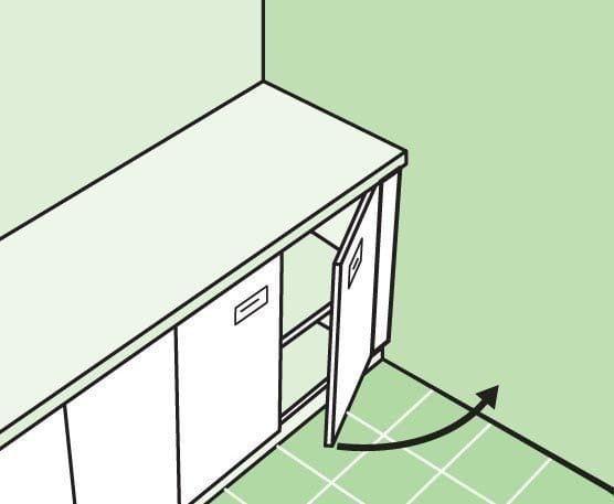 Между стеной и дверцей последней тумбы или подвесной полки обязательно должен оставаться зазор. Это даст возможность беспрепятственно открывать ящики. Свободное место при этом не будет пустовать. Вдоль стены часто прокладывают кабеля или трубы.