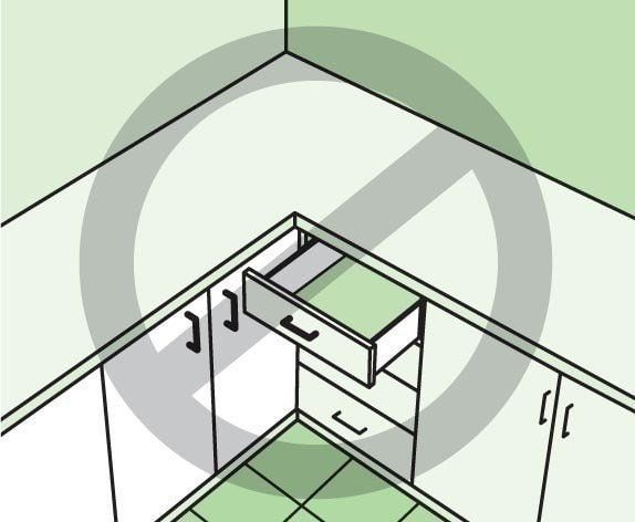 При угловом размещении мебели важно избегать «мертвых зон». Касается это не только размещения мебели, но также посудомоечной машины и духовки.