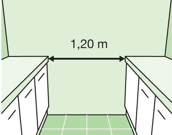 Если мебель на кухне расположена параллельно, то расстояние между ней приблизительно должно быть около 1,2 м: это обеспечит не только свободное передвижение, но и беспрепятственный доступ к содержимому столов и полок.