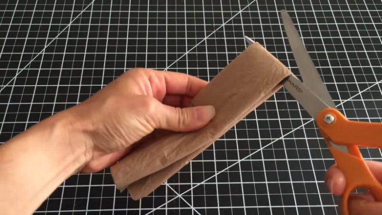 Для начала складываем пакет пополам, затем ещё раз пополам, отрезаем верх и низ.