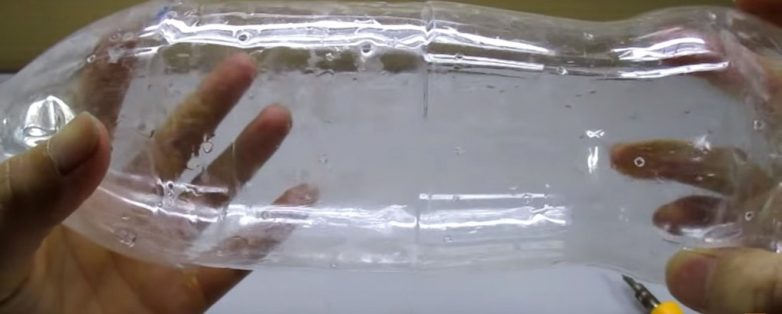 2. С помощью шила (или другого острого инструмента) по всей поверхности бутылки сделайте отверстия, размер их должен быть достаточным для слива лишней воды, но меньше, чем диаметр зёрен.