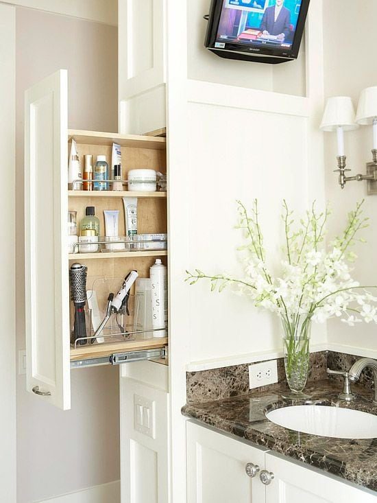 Хорошо, когда вещи в комнате лежат на своих местах, не портят внешний вид интерьера и при этом сохраняют драгоценное пространство. Особенно актуальна эта тема в ванной комнате.