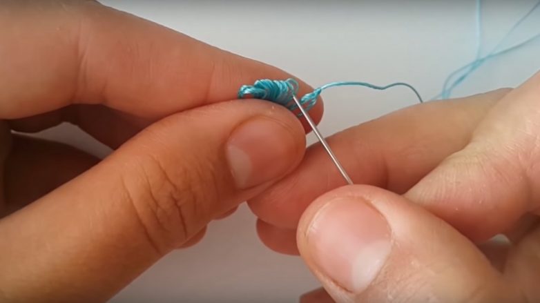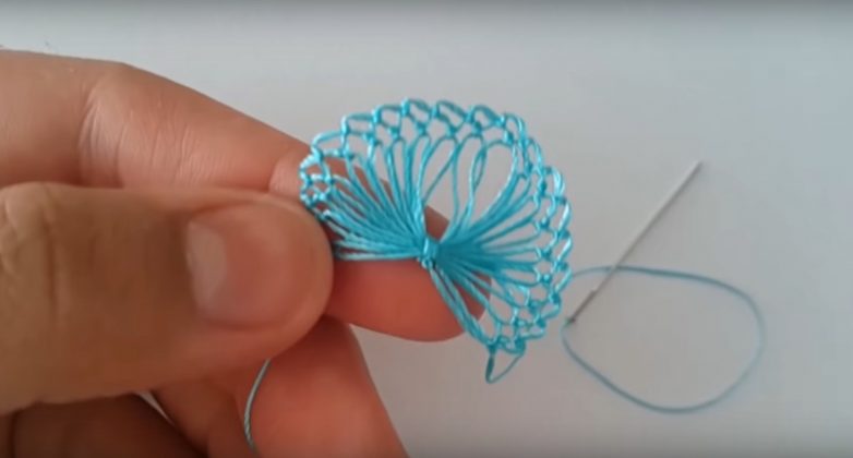 Когда сделал несколько витков, нужно перевязать их посередине. Для этого продень нить в иголку и перевяжи несколькими витками поперек. Завяжи получившийся бантик на узелок. Хорошенько затяни его.