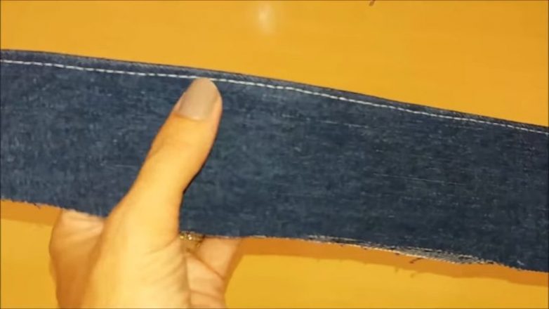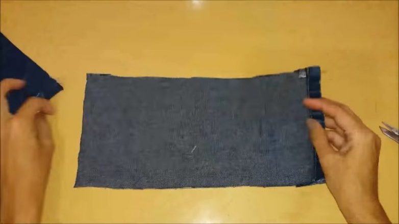 2. У джинсов отрежьте кусок штанины, обрежьте оба края, оставляя два куска материи. Всего понадобится 4 таких куска для одного тапка.