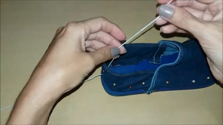 7. Наденьте на ногу, приколите со всех сторон булавками, заверните внутрь края и начинайте пришивать по периметру подошвы и между двух джинсовых частей.