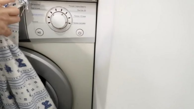 На кухне уместилось буквально всё: и небольшой холодильник под рабочей поверхностью, и стиральная машина в углу, и целая стойка под кухонную утварь, спрятанная за тканевой ширмой.