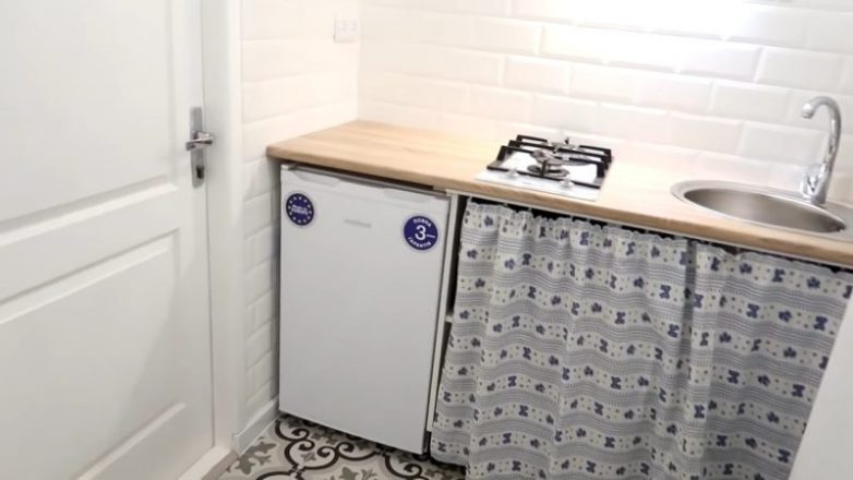 Справа установлен бойлер. Двухконфорочной плиты и раковины более чем достаточно для жизни 1-2 человек.