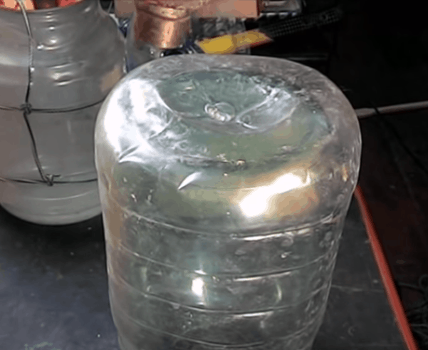 Начинаем обдувать банку теплым воздухом. Делаем это постепенно, чтобы позволить воздуху, находящемуся между банкой и баклагой выйти.