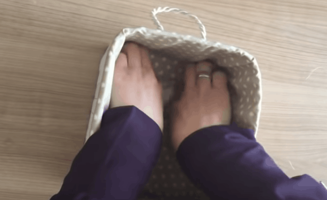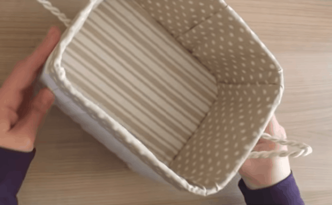 Берем ткань и оборачиваем корзинку с таким расчетом, чтобы декоративная полоса находилась поверх ручек и внутренние стенки корзинки были тканевыми.