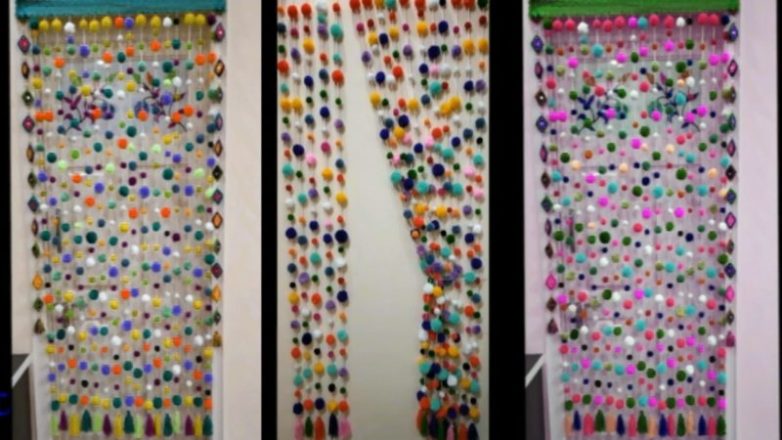 Цвет и размер помпонов из пряжи можно варьировать на свой вкус, чтобы удачно сочетать нитяную штору с интерьером комнаты. Помимо пряжи, вам также понадобится тонкая деревянная палка, на которую можно будет подвесить декор из пряжи.