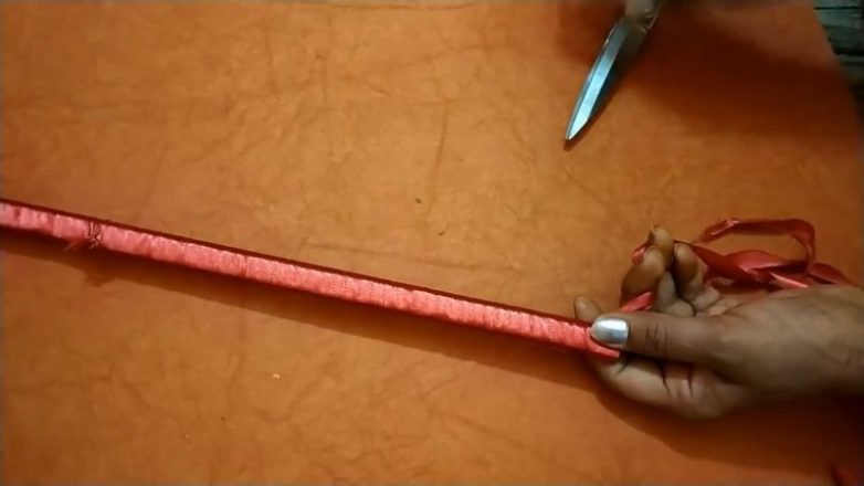 Когда все нити с помпонами будут готовы, начинаем делать держатель. Деревянную палку оборачиваем лентой, закрепляем.