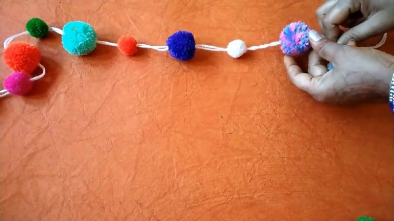 Отмеряем нужную длину будущей кисеи, отрезаем равную длину пряжи (например, белого цвета), складываем пополам, продеваем иглу. Сначала нанизываем на нитку с иголкой кисточку, спускаем её в самый низ, завязываем узел, затем нанизываем на иголку с ниткой помпоны, меняя цвет и размер.