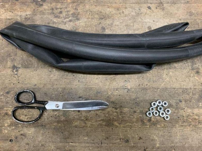 Итак, давайте же посмотрим, как можно быстро, легко и дёшево сделать ледоступы.1. Для начала отыщите у себя в инструментах где-то 20 гаек, возьмите старую велосипедную камеру и ножницы