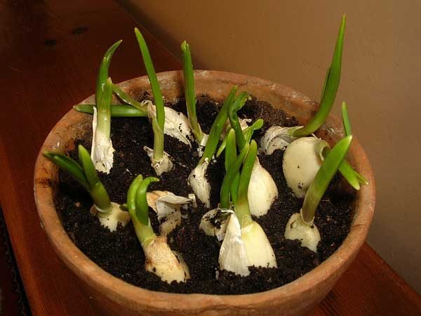 Не стоит глубоко закапывать чеснок, достаточно, чтобы зубок был полностью покрыт. Земля в горшке не должна пересыхать, при этом повышенная влажность чесноку не нужна. Важным условием для получения хорошего урожая является достаточное количество света. На подоконнике горшку с зеленью самое место.