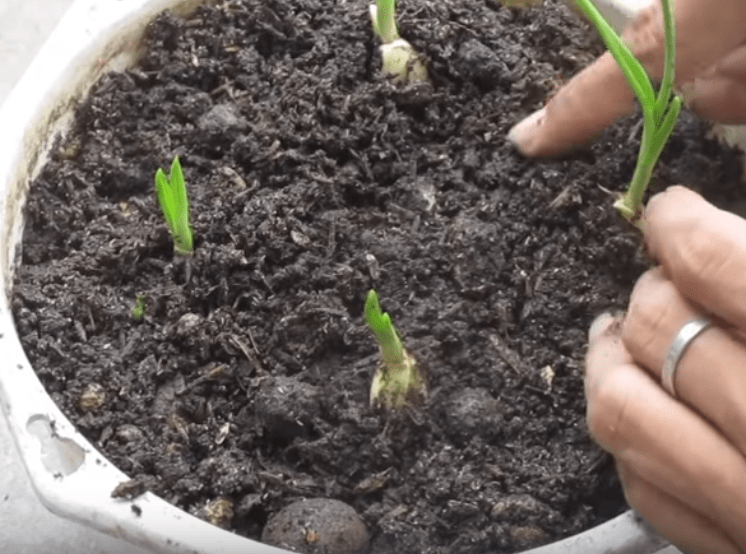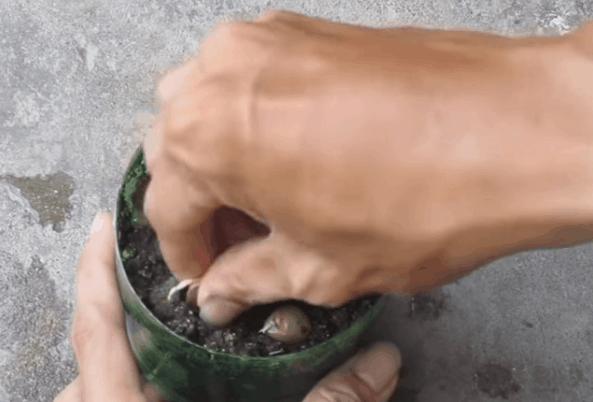 Высаживаем в землю, выдерживая расстояние между зубками в 7-10 см. Если почва очень тяжелая, предварительно перемешиваем ее с песком.