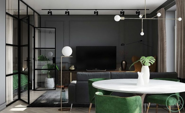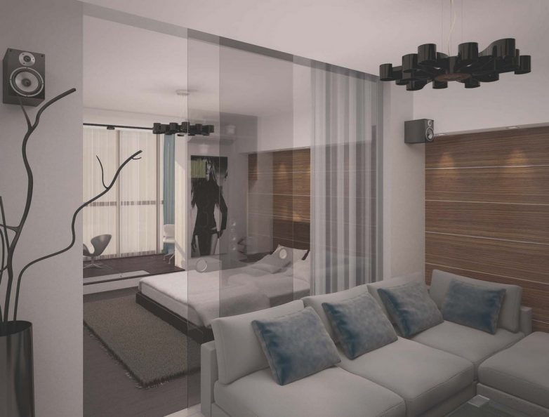 Чтобы зонировать «однушку», стоит использовать стеклянные перегородки, которые пропускают световой поток и смотрятся практически незаметно. Они не утяжеляют и не загромождают пространство. Это очень важно. Такая ошибка в маленькой квартире недопустима.