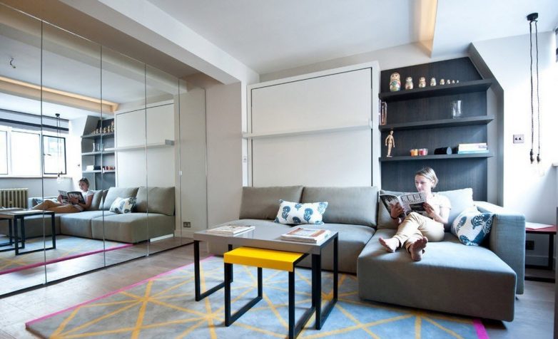 При желании иметь одновременно кровать и диван в однокомнатной квартире-студии следует расположить их друг напротив друга. Сегодня существуют современные кровати, монтирующиеся в стену.