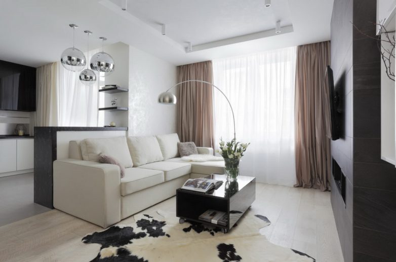 Зону для приготовления пищи и гостиную можно разделить аркой. В такой перепланировке обязательно используют разное напольное покрытие: в гостиной – ламинат, в кухне – плитку. Гостевую зону лучше расположить около окна. Сюда стоит разместить диван, шкаф, кресла, столик и телевизор. На кухне следует установить барную стойку.