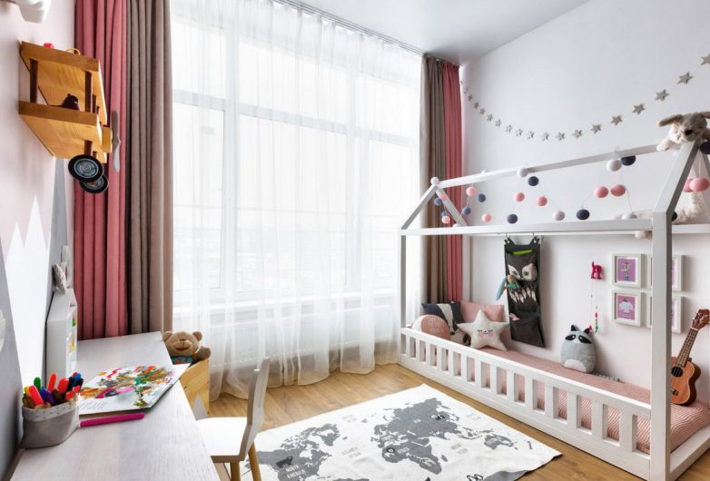 Если высота потолков в квартире больше 2,5 метров, можно соорудить «второй этаж», например, для детской. Оптимальным вариантом для лестницы будут ступени из тумбочек, где можно разместить игрушки, книги, детские вещи.