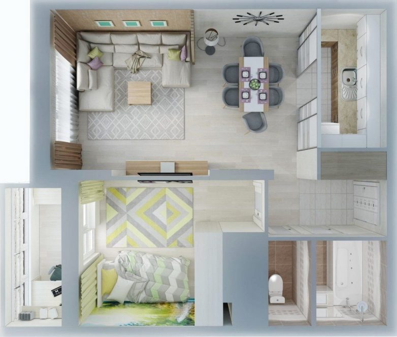 В однокомнатной «трешке» будут спальня, детская и гостиная. В центральной зоне разместится гостиная, соединяющая все комнаты в единое пространство. Чтобы оно получилось воздушным и легким, двери из проекта стоит исключить. Стеновые перегородки поднимать рекомендуется не выше, чем на 1,4 метра. На кухне – можно использовать стол-трансформер, а в ванной – компактную душевую кабинку.
