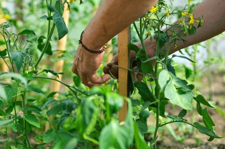 Когда кусты подрастут настолько, что им станет тяжело держать самих себя, подвяжи их. На расстоянии 5 см от стебля установи жердь. Обкрути стебель шнуром и привяжи к жерди. Когда завяжутся плоды, то же сделай и с кистями, иначе заломы будут препятствовать наливу плодов. Можешь под них также подложить дощечки, чтобы томаты не касались земли.
