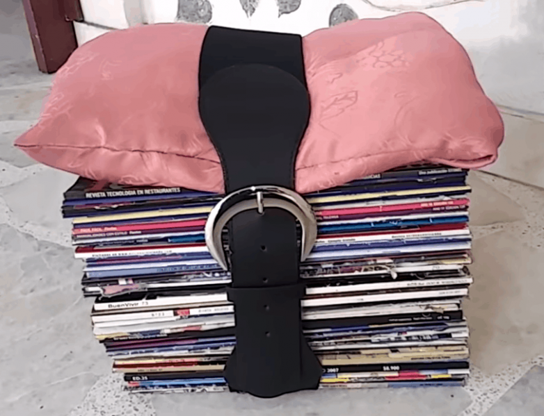 Соорудить банкетку можно в считанные минуты: на стопку журналов укладываем сидушку и обхватываем получившуюся конструкцию ремнем.
