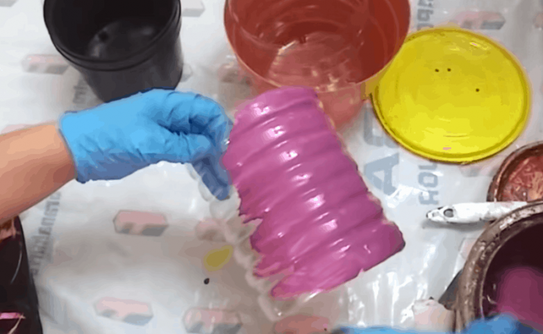 На нашей вертикальной клумбе будут только яркие кашпо. Для их создания окрашиваем обрезанные пластиковые бутылки и имеющиеся в наличии пластмассовые горшки.