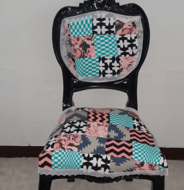 Находим подходящий кусок ткани и закрепляем новую обивку поверх старой.