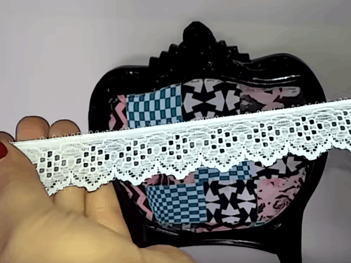 Подбираем кружево или тесьму, чтобы скрыть скобы.