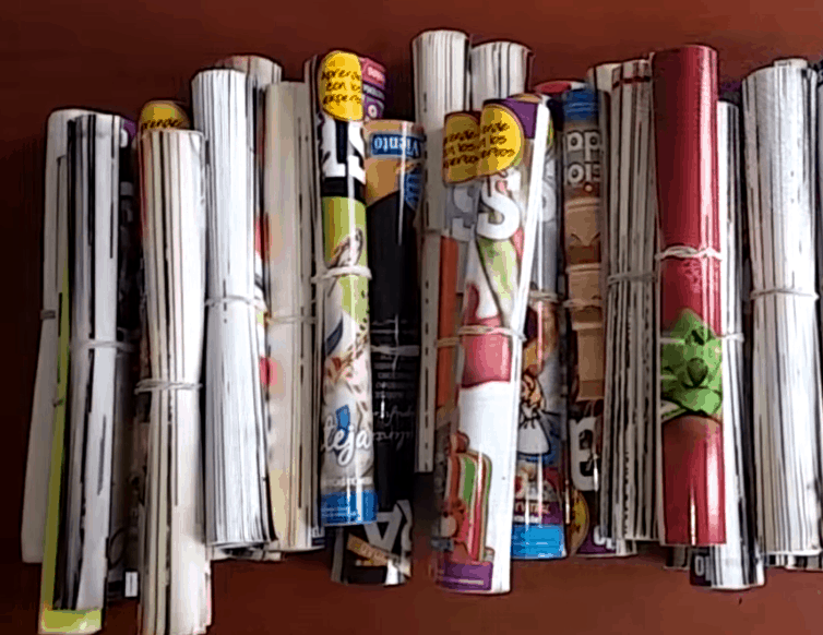 Набрав достаточное количество журналов, перехватываем их ремнем и устанавливаем на подставку. В нашем случае она даже вращается.