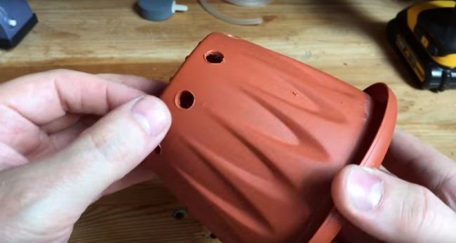 Но у автора горшок без отверстий, и поэтому он сделает отверстия с помощью дрели и зенкера.