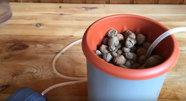 Наполнить систему раствором нужно таким образом, чтобы раствор слегка касался горшка.