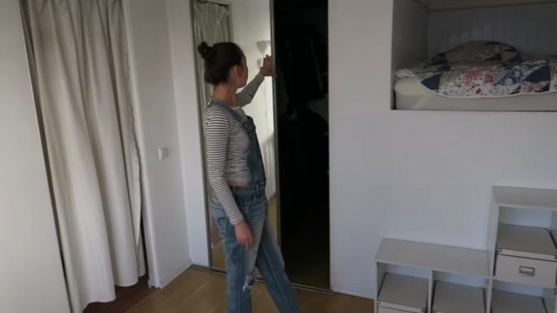 Здесь включается свет. Места вполне достаточно. Тут девушка хранит сезонные вещи и те, которые редко используются. Все работы она выполнила своими руками. Согласитесь, необычное решение для типовой хрущёвки-однушки!