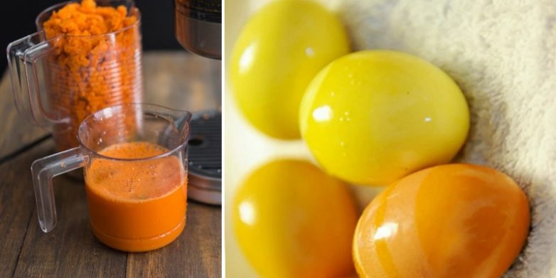 Свежую морковь натри на самой мелкой терке и выжми сок. 1 ст. л. паприки залей кипятком и тщательно перемешай. Дай остыть, процеди и смешай с морковным соком и 1 ч. л. уксуса. В полученную натуральную краску положи отваренные яйца. Результат тебя порадует — красивый оранжевый оттенок!