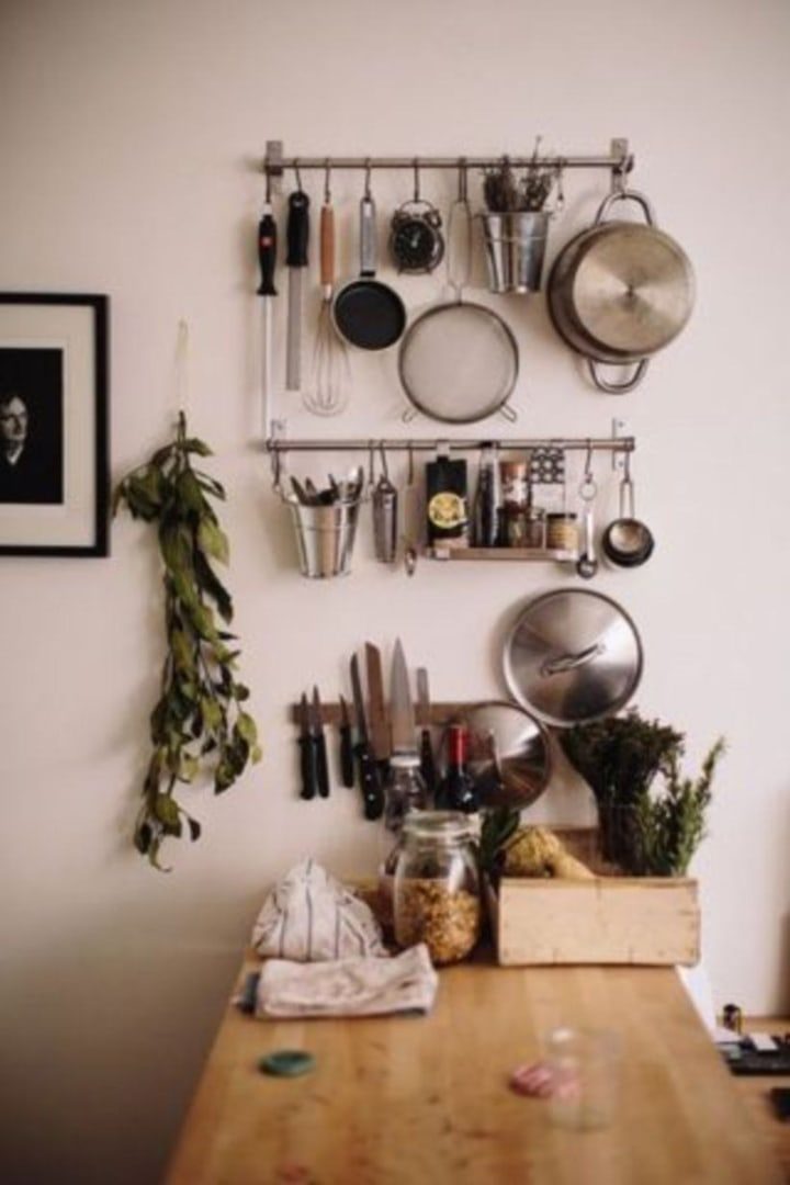 Сэкономить ценное на кухне пространство можно, использовав стену. Навесьте несколько штанг с крючками и магнитную поверхность, к которой отлично крепятся ножи и лопатки.