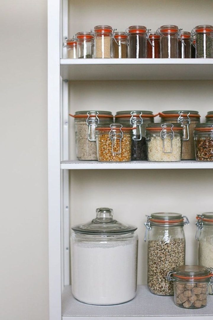 Размещение бакалеи в контейнерах позволит избежать захламленности в шкафах. Кроме того, их можно ставить друг на друга