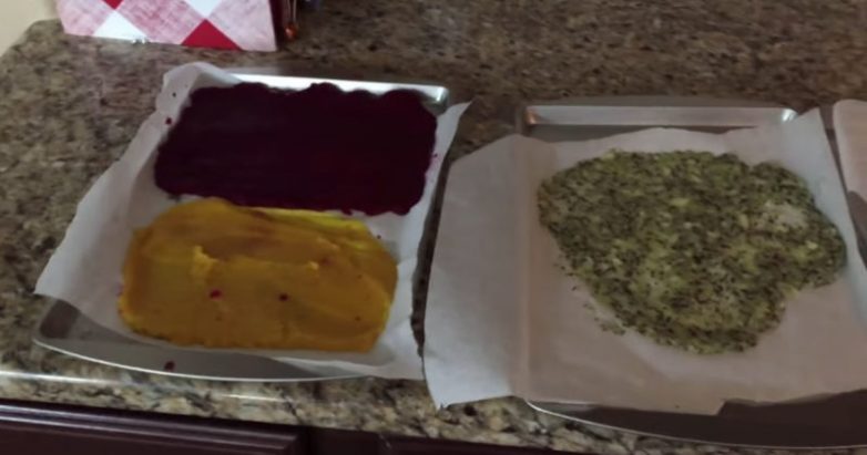 Итак, у вас остался процеженный сок и пюре. Пюре выложите на противень, застеленный пекарской бумагой. Отправьте противни в духовку, разогретую на самый минимум (около 90-100 градусов), на всю ночь.
