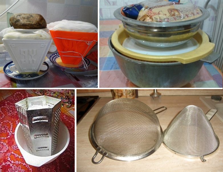 Пасочницу можно приобрести в посудной лавке или заменить подручными средствами. В качестве формы подойдет дуршлаг, сито, терка и даже новый цветочный горшок. Форму всегда нужно застилать несколькими слоями влажной марли.