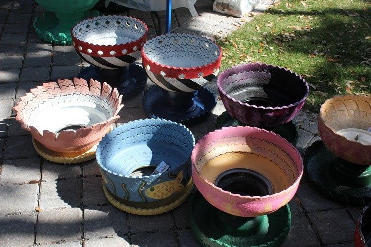 При желании старые шины несложно превратить в шикарные напольные вазоны для цветов.