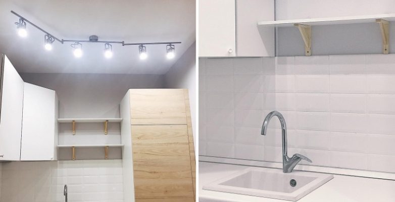 В данном случае две полки идеально вписались между угловым навесным шкафом и встроенным холодильником. От плиты они находятся на приличном расстоянии, поэтому жира никакого, воды тоже никакой.