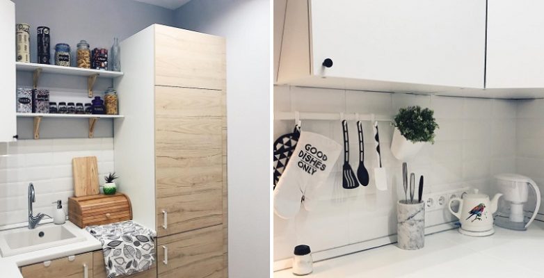 Так стала выглядеть кухня после заполнения открытых полок. На них можно поставить всё что душе угодно, начиная от баночек с сыпучими продуктами и заканчивая посудой, бокалами, постерами, цветами… Пыль достаточно протирать раз в две недели.