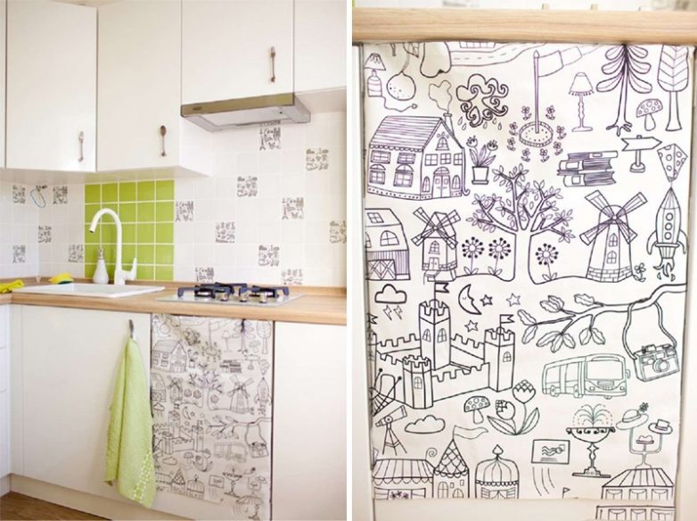 Несмотря на то, что в магазинах полно разнообразного товара, что аж глаза разбегаются, когда ты ярко представляешь свою кухню во всех мелочах, рискуешь не найти нужного цвета штор, стола или обоев. К счастью, с обоями просто: есть белые обои для покраски, на которых можно нарисовать несложные узоры или фигуры, и не обязательно при этом уметь рисовать.