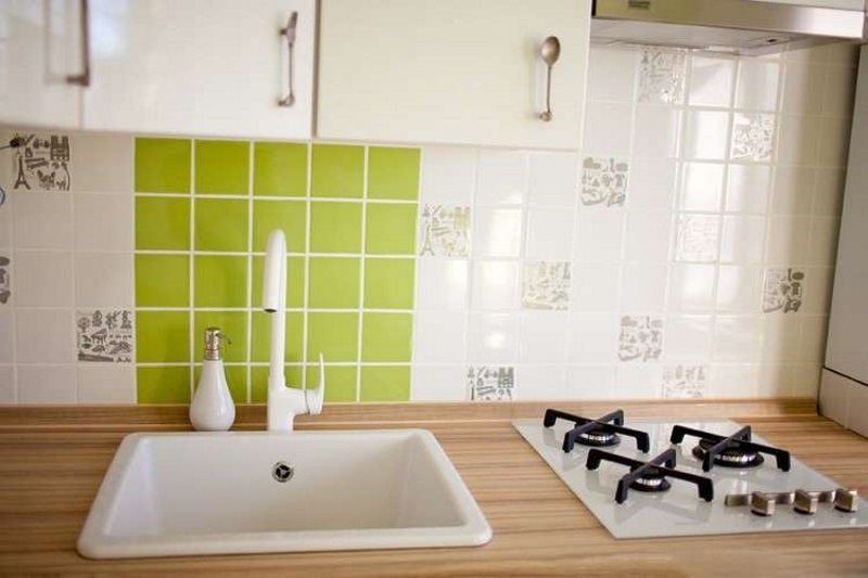 Защитный фартук за плитой — это отдельный разговор. Есть несколько разновидностей недорогого фартука: можно сделать из стекла с ярким рисунком, некоторые умудряются сделать из пластиковых панелей. Но самое трудное — самому выложить плитку для фартука. Интересная идея: если плитки вдруг не хватило, можно разбавить ее другим цветом или, как в этом случае, выбрать плитку с рисунками. Выглядит очень гармонично и приковывает взгляд.