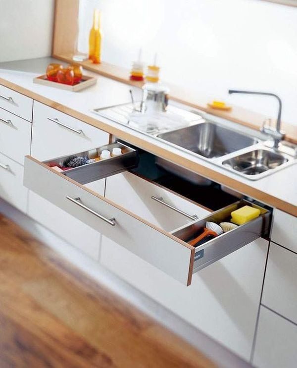 Выдвижные или откидные полки, рейлинги, различные по конфигурации и наполнению системы хранения продумать можно по-разному. Многое при выборе зависит от количества свободного места и формы самой мойки. В конструкции, где мойка обрамлена столешницей, использовать для кухонной утвари, чистящих и моющих средств и прочих принадлежностей можно не только боковое пространство, но и верхнюю панель. При желании легко задействовать даже дверцу. Взгляните на уже реализованные удачные идеи, возможно какая-то из них станет для вас руководством к действию.