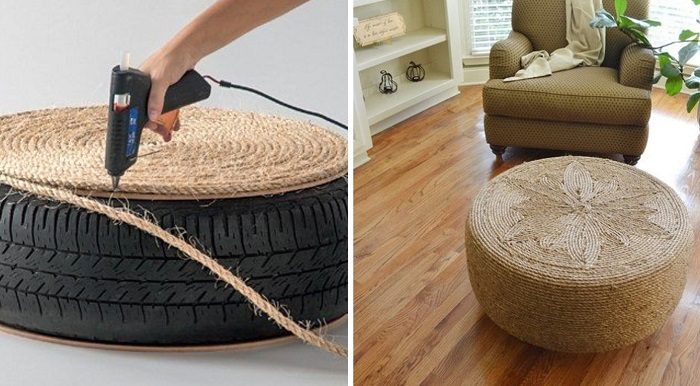 Смотри, какой оригинальный столик может получиться из автомобильной шины! Главное запастись большим мотком толстого каната и хорошим клеем.