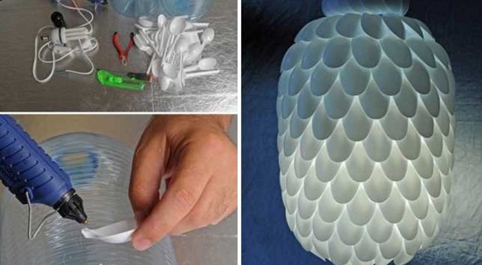 Мне особенно понравился оригинальный абажур для лампы, который можно сделать из нескольких упаковок одноразовых пластиковых ложек.