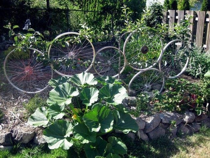 Не стоит избавляться от старого велосипеда, его с успехом можно использовать для создания оригинального дачного декора. Тщательно вымытое или разобранное по частям транспортное средство способно перейти из разряда металлолома в разряд дизайнерских украшений.