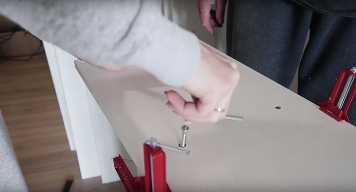 В зависимости от того, какое наполнение гардеробной вам хочется видеть, могут потребоваться ящики, полки, штанги. Для полок достаточно собрать ДСП, прикрутив к боковушкам доски с помощью конфирматов.