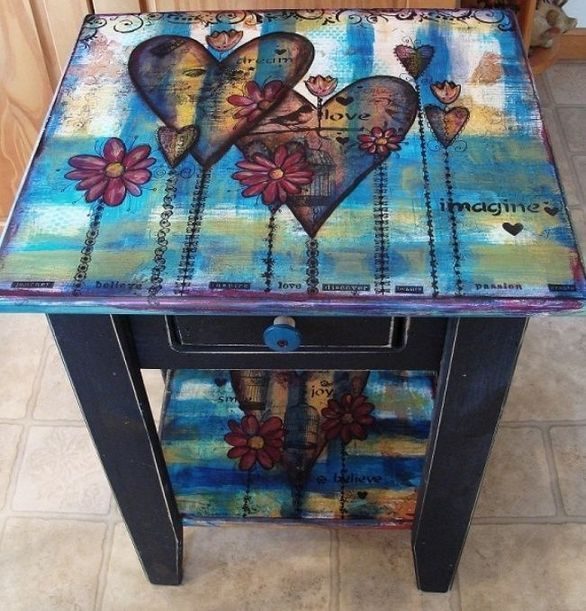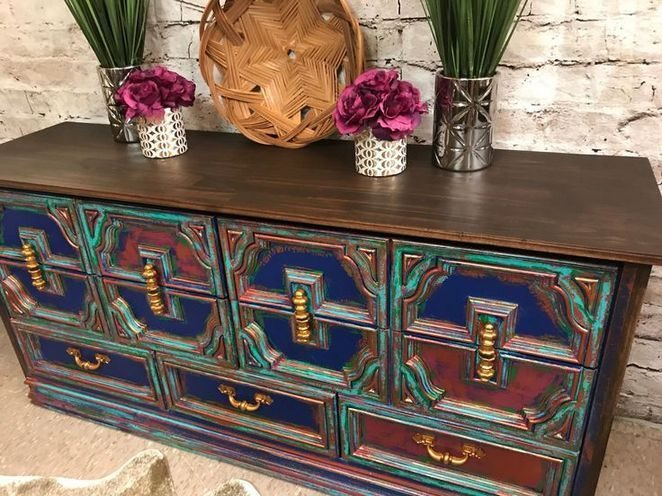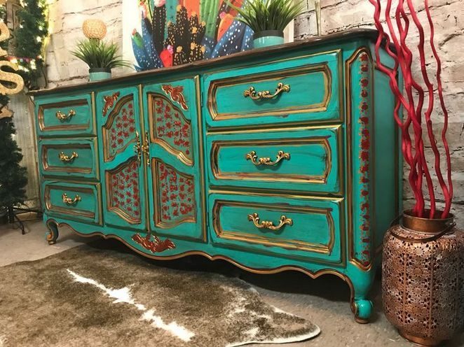 Для работы замечательно подходит старая деревянная мебель. С такой поверхностью легко работать. Старую краску и лак можно удалить, а можно нарочито сделать эффект состаривания